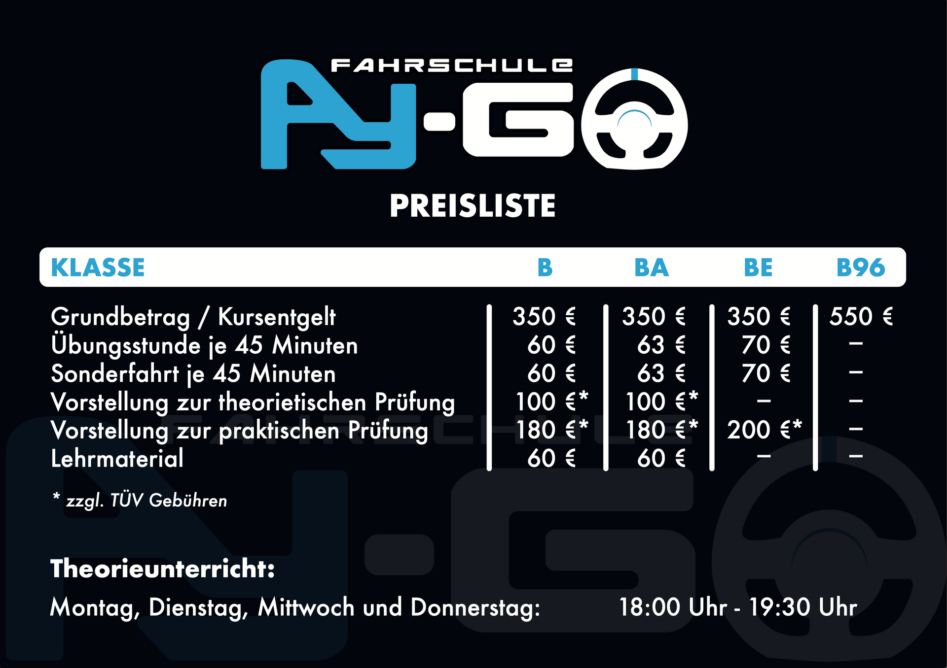 Die Theorie ist bekanntlich die Grundlage der Praxis. An drei Tagen pro Woche bieten wir Dir in einer angenehmen Atmosphäre den theoretischen Teil des Führerscheins an.